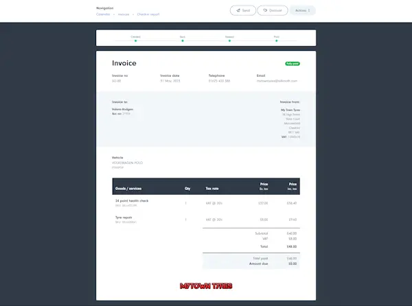 From the job sheet you can create invoices with a single click and send them to customers via email or text message. With Autowork Go you can also track payments and manage any outstanding debts.